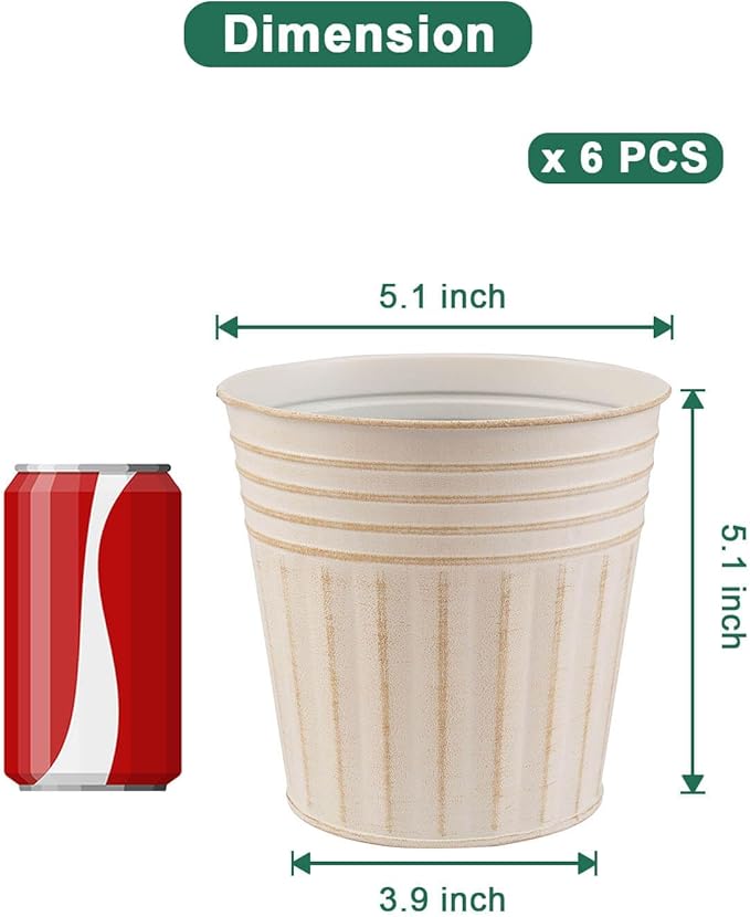 - 【Size of Metal Pots】There are 6pcs metal planters in a package, Topper opening diameter 5.1 inch, bottom diameter 3.9 inch, barrel high 5.1 inch.
