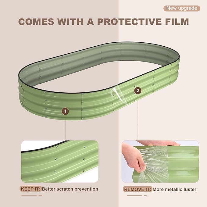 - DURABLE DESIGN: This galvanized raised garden bed, with a Zinc-Aluminum coating, is designed to enhance longevity and withstand various environmental conditions. The coating helps prevent oxidation and increases surface hardness. Its thickened design and oval shape ensure even pressure distribution, making it highly resilient against external forces. Reusable for years