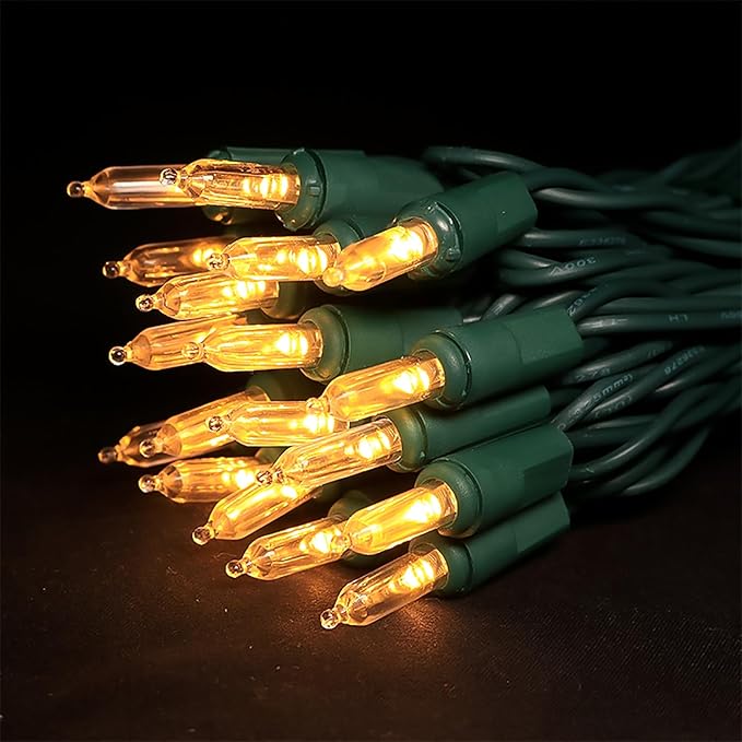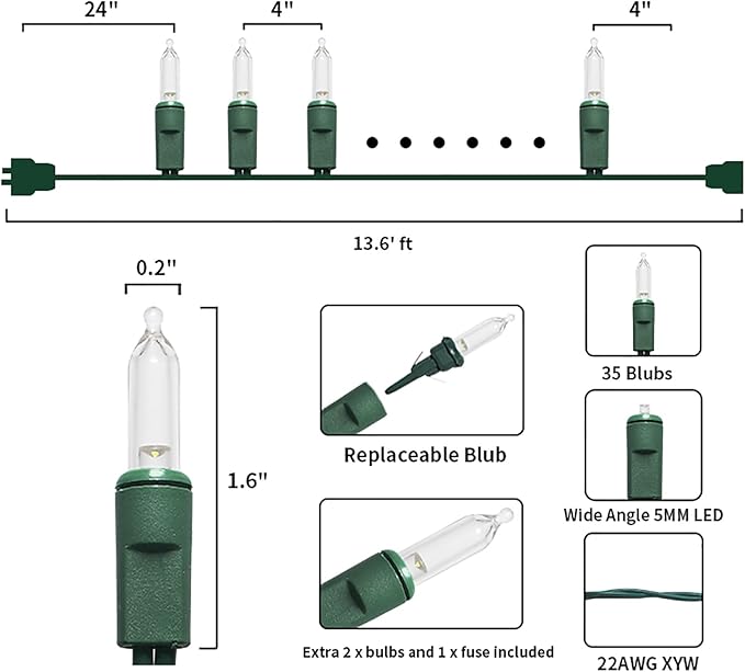 - 【Mini Christmas Lights Specification】: 1 Sets - green wire chritsmas light string includes 35 count warm white LED lights, total length 13.6ft, lights length 11ft and each led is 4 inches apart, 24 inches lead wire, 4 inches end connector (Extra 2 x bulbs and 1 x fuse included)