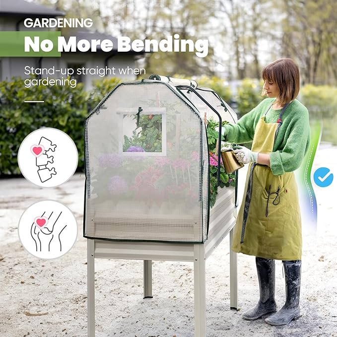 - 【Spacious Planting Space】Raised garden bed with legs dimensions: 48×24×30 IN, the total height after adding the greenhouse is: 56 IN, boasting a deep 11.8" raised planter box—way beyond the standard 8". With room for 50 gallons of soil, your veggies, fruits, herbs, and flowers will thrive.