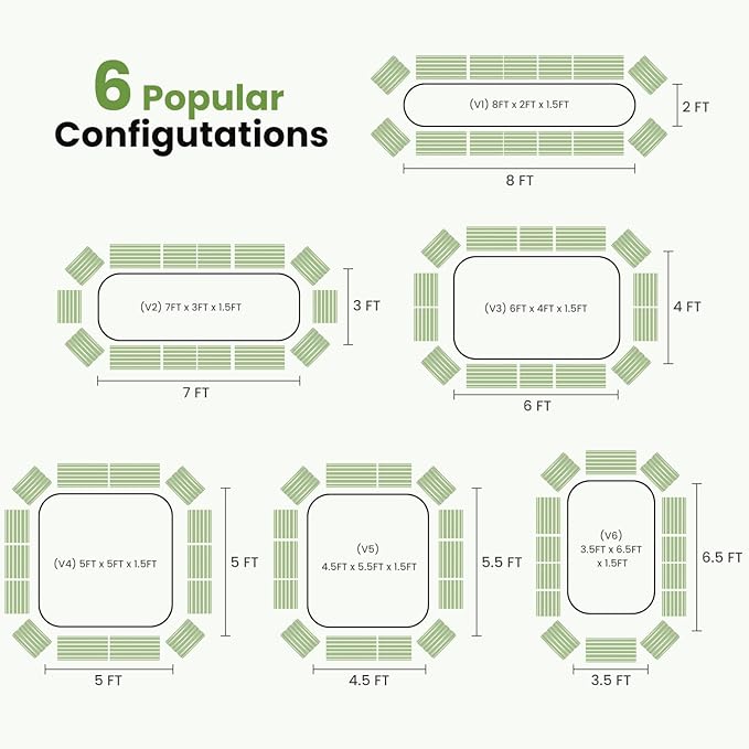 - Standard size and popular color: The raised garden bed is 8x2x1.5ft, with 4 bent panel, 6*1FT and 4*1.5FT straight panels. You can assemble them into 31 possible configurations to fit your plants, and choose your optimal configuration based on the layout of your gardening area. Two steel support bars help the panels keep their shape, preventing warping and soil leakage over time.