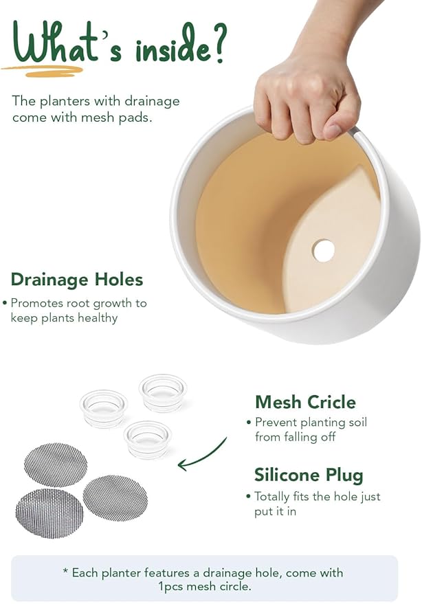 - Drainage Hole & Accessories: Each indoor planter pot features carefully designed drainage hole to maintain optimal soil moisture; The inclusion of silicone plugs and mesh pads provides added convenience, giving you flexibility in how you care for your plants