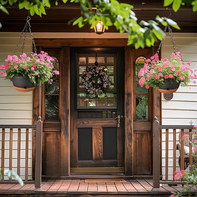 • 【Thicken Material 10 inch Hanging Plant Pots】Our plant hanging basket crafted from sturdy plastic, these 10 inch hanging planters withstand various harsh weather conditions for extended periods, ensuring planters withstand various climates and temperatures without fading or cracking, even during prolonged outdoor use. Lightweight and versatile self watering wall planter, each hanging baskets for plants set comes with two S-shaped hooks for easy installation.