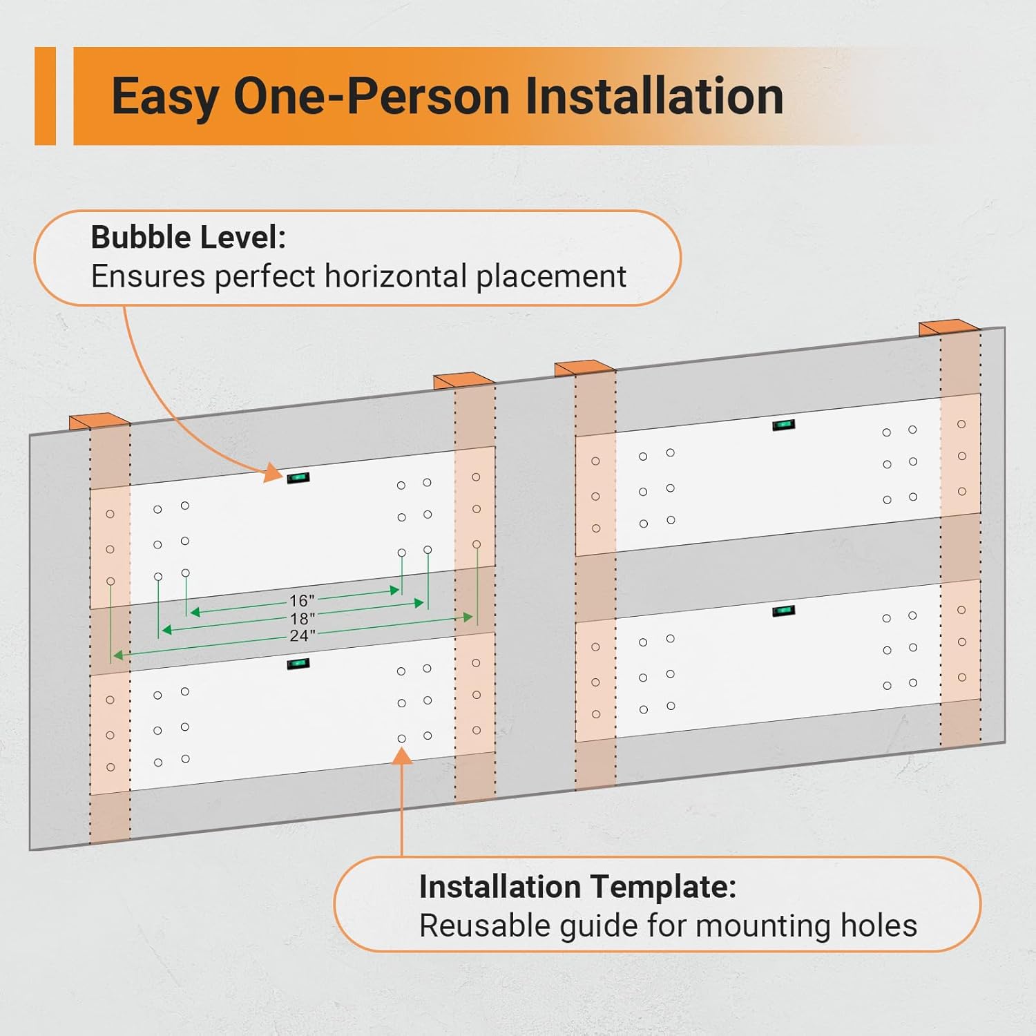- Adjustable Spacing Design: Compatible with different stud spacing and wall types such as wood studs/joists and concrete walls (cannot be installed on metal walls) and can be used with wood stud spacing of 16", 18" or 24" .