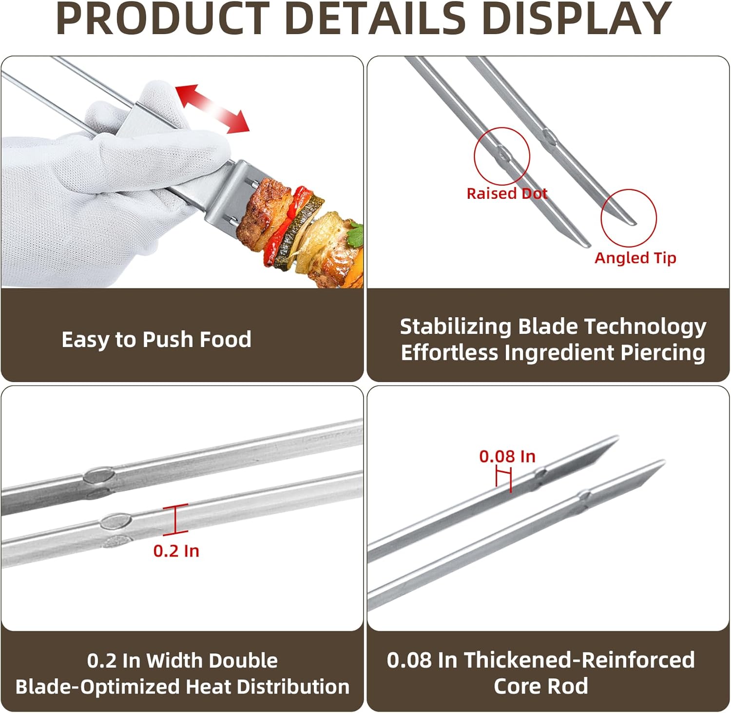 - 【Big Handle for Comfortable to Hold】Our metal skewers for kabobs feature an oversized oval design, providing a comfortable grip for hands of all sizes even when wearing gloves while minimizing hand fatigue during long grilling sessions. In addition, sharp angles are not too sharp but can easily penetrate food. The pointed protrusion design effectively prevents food from falling off. Lightique's revolutionary design of skewers for kabobs is definitely a must-have for your barbecue party!