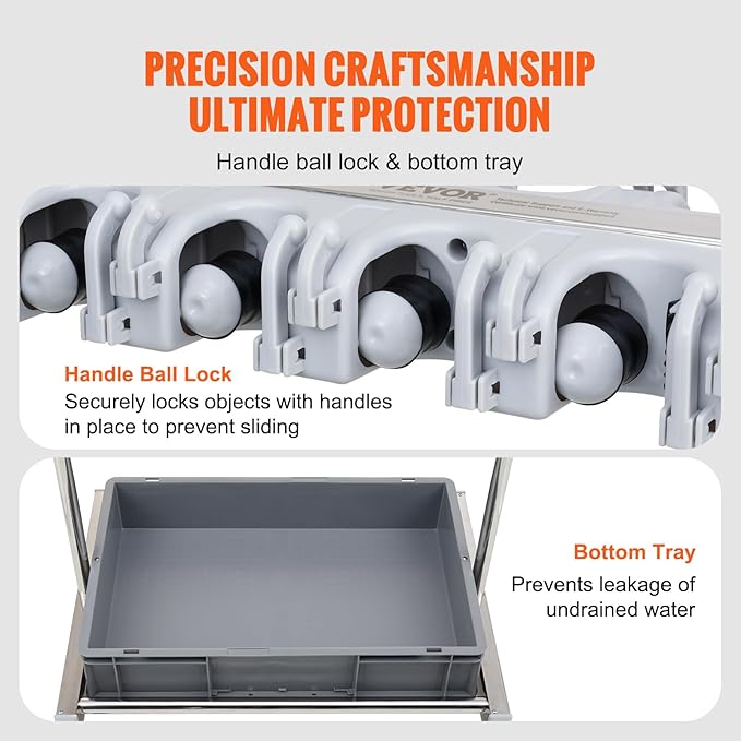 - Convenience at Its Best: The lawn tool organizer comes with 4 swivel wheels (2 of them with brakes) for easy movement between spots. It's got your back with a handy PP tray at the bottom that stops wet mops from dripping and keeps your floor squeaky clean.