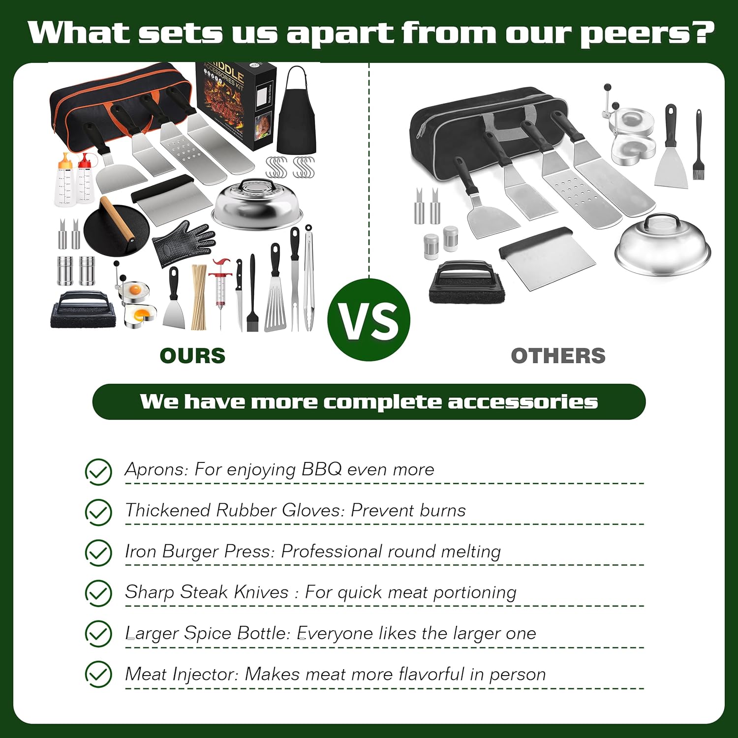 - 【Premium Quality】: Our Furnhome 134pcs Griddle Accessories Kit is crafted with heavy gauge stainless steel, ensuring durability and long-lasting performance. You can trust that our BPA-free, rust-resistant, and durable tools won't crack or melt with long-term use. Say goodbye to flimsy tools that bend or break easily during outdoor grilling sessions.