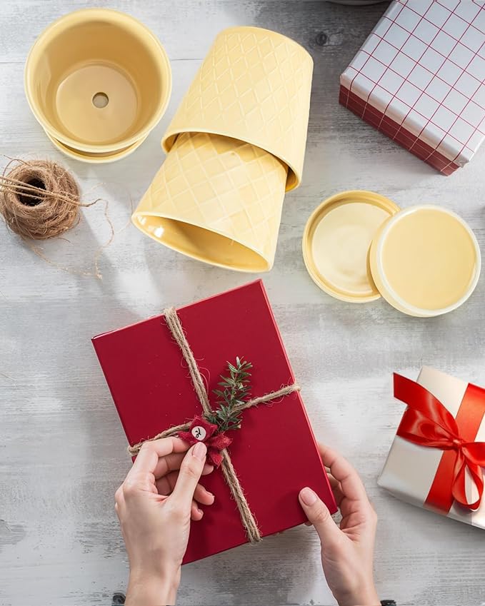 Ceramic Plant Pots –5 inch Indoor Flower Pot with Drainage Hole and Ceramic Tray - Gardening Home Desktop Office Windowsill Decoration Gift, Set of 4-Plants NOT Included(Yellow)