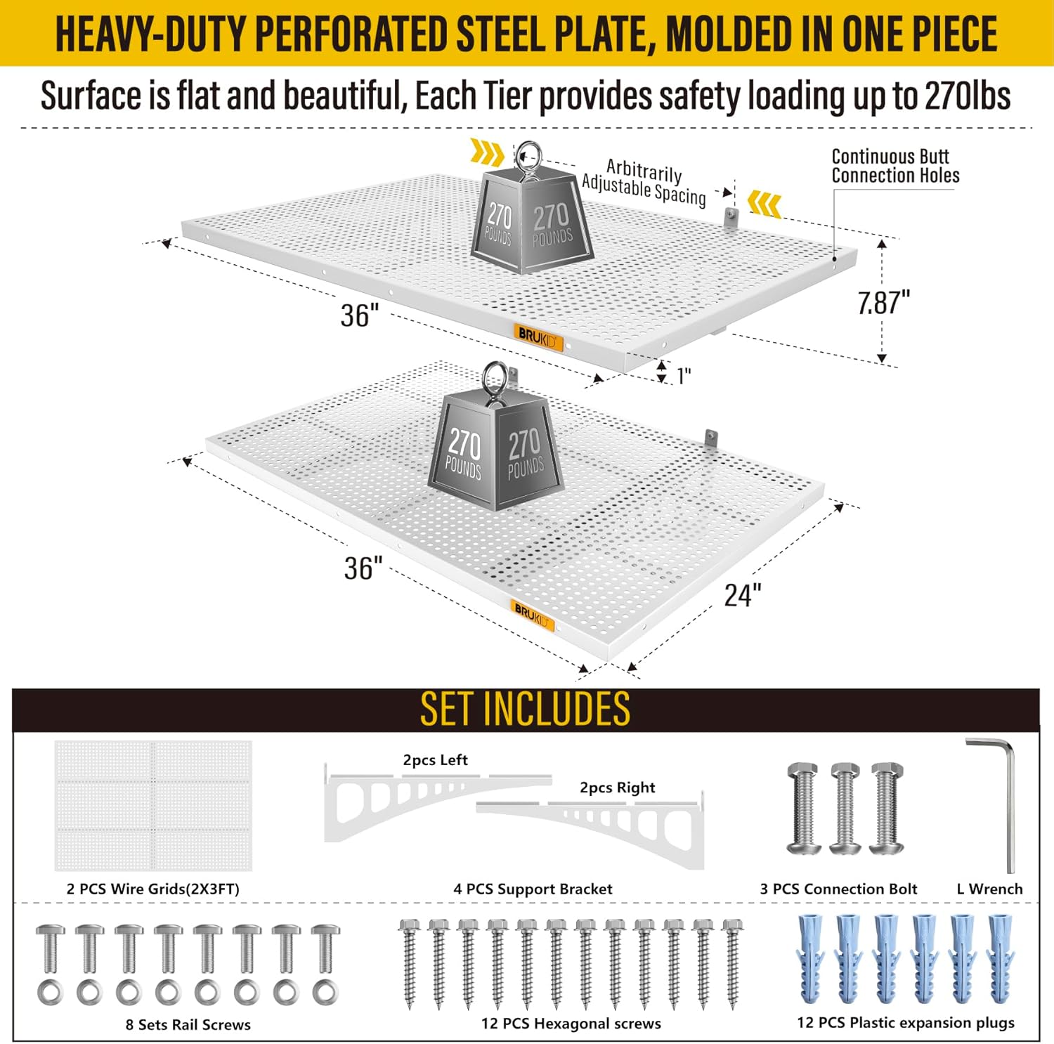 - SUPERIOR DESIGN: Wall shelf garage storage rack panel is made of whole piece of perforated steel plate bending and welding, the surface of matte high temperature powder baking paint, flat and smooth; the panel adopts slide rail design, can be adjusted by parallel left and right sliding at will; bracket can be freely installed in 33” range of the spacing of the wood wall keel, without affecting the precision connection with the panel, eliminating the worry of being unable to docking due to the mismatch of spacing points of load-bearing wood wall keel or inaccuracy of the installation of the bracket. It saves time and labor
