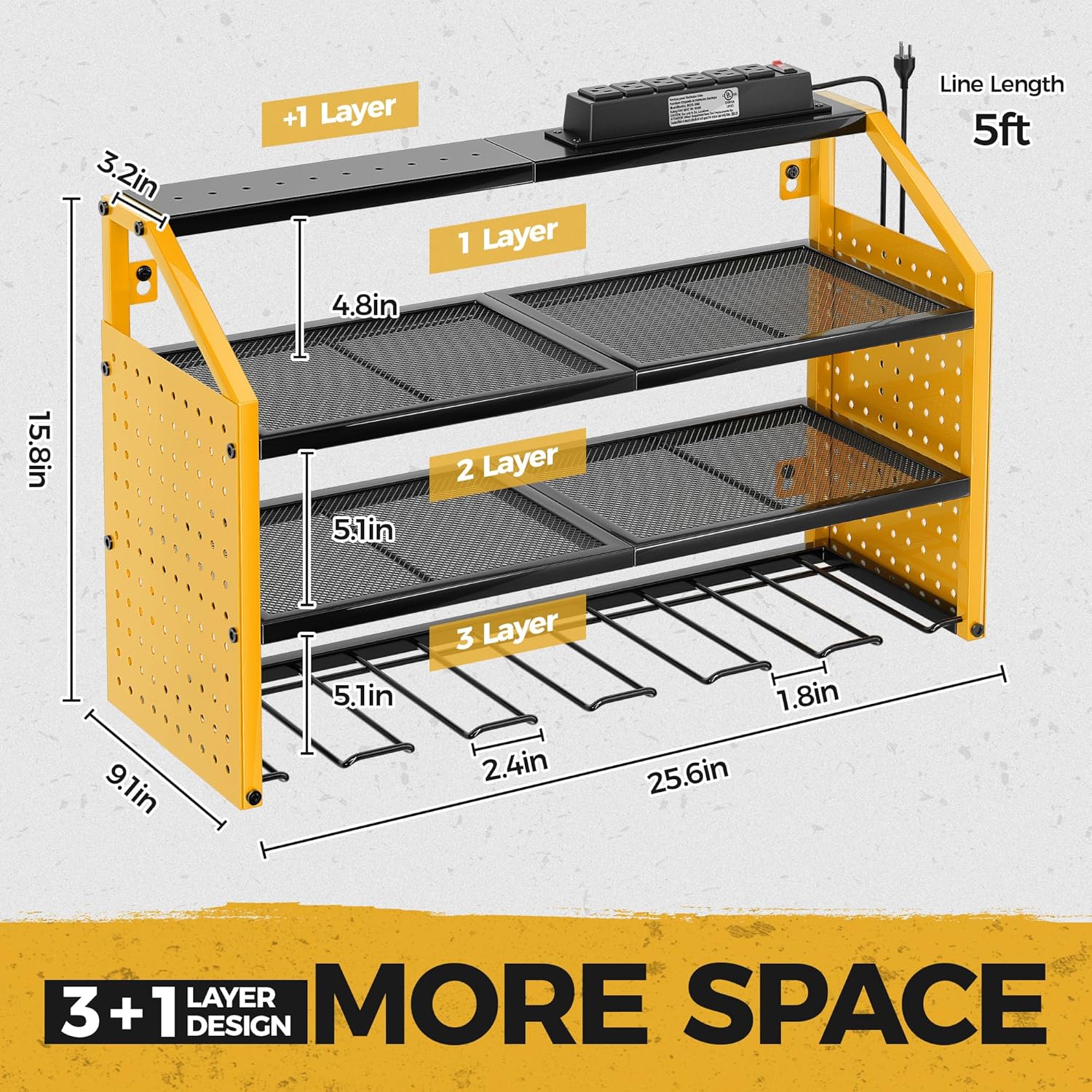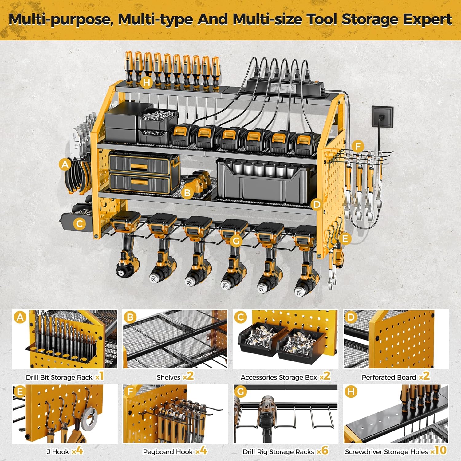LBT Power Tool Organizer With Charging Station,Patented,Heavy Duty Steel,6 Drilling Rig Sizes With Hooks And Screw Boxes,6 sockets,Easy To Install Garage Storage Rack,Great Gift For Men, Yellow