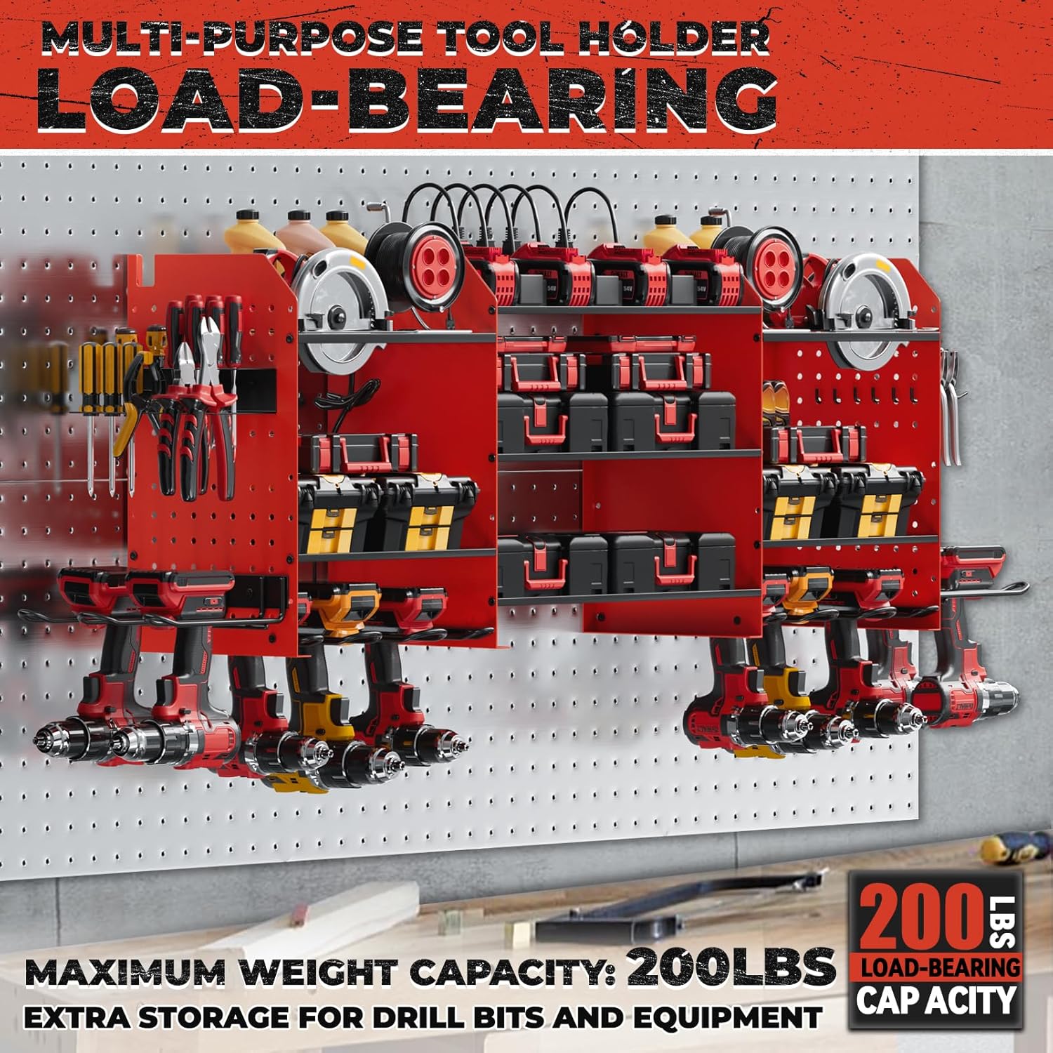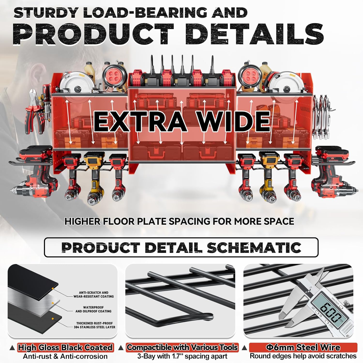 - [Perfect Garage Companion]Utilizing wall-mounted installation, this power tool rack maximizes unused wall space, saving time in tool retrieval. Ideal for garages, homes, workshops, sheds, backyard shops, and more, it offers suspended tool organization and storage.