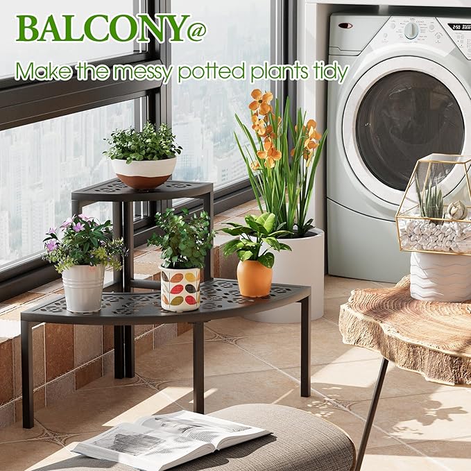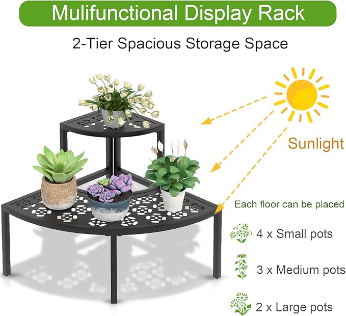 - 【2 Tiers Corner Shelf】This plant rack features 3 tiers to showcase your beautiful flowers, succulent collection, yard decorations, garden tools, and so on. 90° design is saving space and ideal for placing it in the corner.3 tiered plant stand provides large storage space, allowing around 9 different size flower pots be displayed.