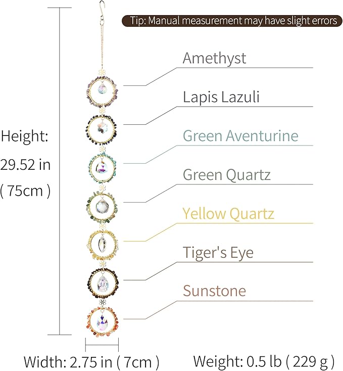 - 【Stunning Design】This chakra wall hanging features a tangle of natural crystal stones in various hues, with seven differently shaped colorful crystals dangling at its center. It not only boosts positive energy in your home but also creates a captivating light-capturing effect, particularly striking in the sunlight.