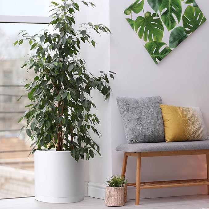 D'vine Dev 2 Pack 14 Inch Modern Plastic Plant Pots, Small Garden Planters for Plant with Drainage Holes and Saucers, White Color, 74-Z-Q-1