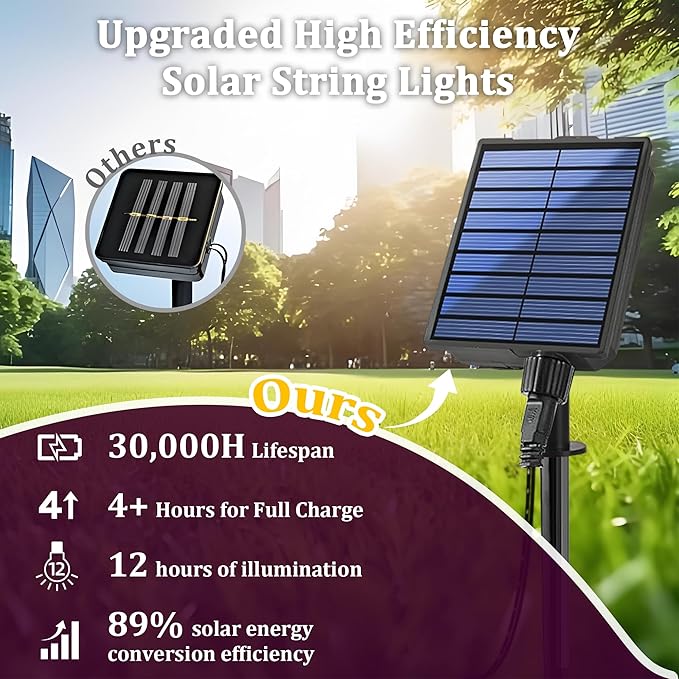 - Upgrade 19 Lighting Modes & Versatility: Our string lights for outside has newly upgraded 19 lighting modes to provide colorful lighting experience. When fully charged, they can Continuous lighting for 10-12 hrs. 4/6/8 hour timer setting and memory function for added convenience. Whether it's holidays or garden decorating, these modes create the perfect ambiance for a variety of occasions. When sunlight is limited, simply charge the solar panels via USB for uninterrupted lighting. Intuitive controls make it easy for everyone to enjoy a vibrant outdoor wonderland!