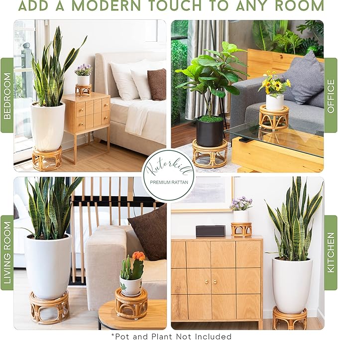 - ☘️【Suitable Size】: The small size rattan stool display stand is: 9.0" × 4 ¾", and the large size of our stand is: 12.0" × 6.0". Modern plant stand has sturdy and durable structure, its 3 thick stand points to firmly support the plant pot. Flat plant stand,there are not too many restrictions on the flower pots used. Best fit 8" - 12" straight cylindrical flower pot.