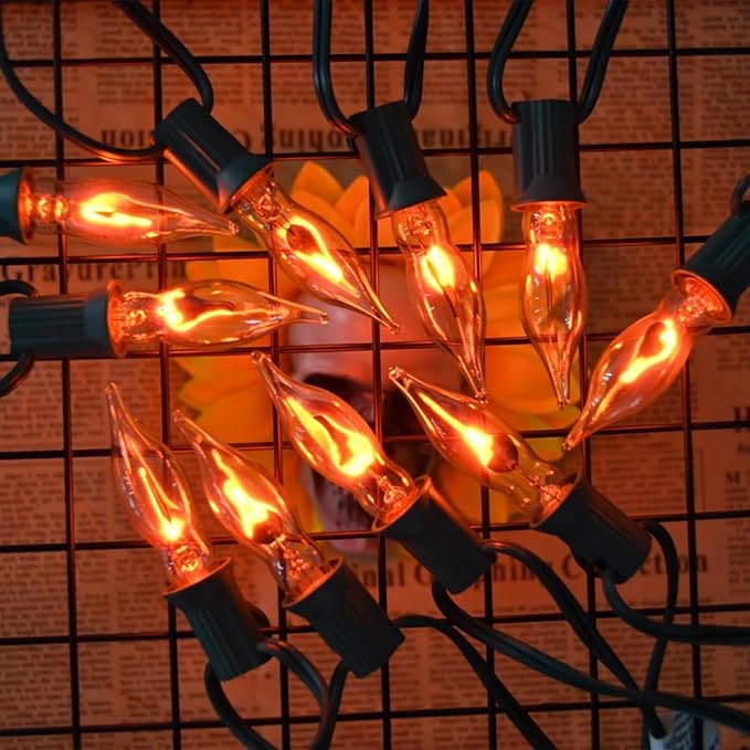 - 🔥【Realistic Christmas Flame String Lights】: 12.8 Feet 10 Lights C7 Christmas lights Flickering Flame String Lights comes with 12pcs 1W clear flame bulbs (2 spare bulbs), fit for C7/E12 screw base,green wire. The flame lights bulbs seem to really burn when energized, with realistic flame flickering effect, like dancing little firemen, mysterious and charming, add a charming and fun glow to your Christmas decorations.