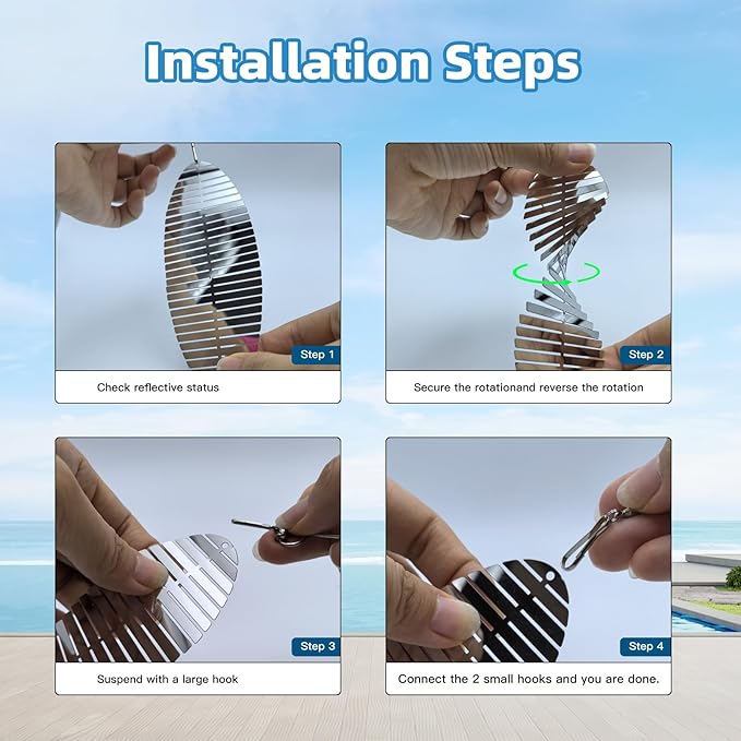 - Eco-Friendly Solution: A humane and environmentally-friendly way to keep birds at bay without harming them. Bird deflectors achieve the goal of keeping birds away by spinning in the breeze to reflect sunlight and create a shiny effect, without causing any harm. Great for protecting your house, garden, swimming pool, farm, fruit trees, patio, pond, lawn, backyard, etc.