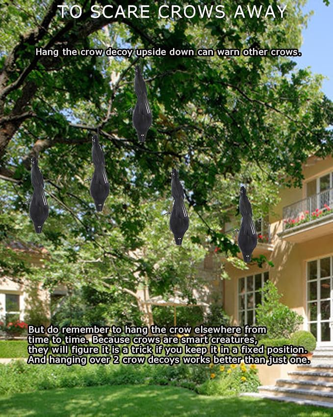 - 【TO SCARE CROWS AWAY】: Hang the crow decoy upside down can warn other crows. But do remember to hang the crow elsewhere from time to time. Because crows are smart creatures, they will figure it is a trick if you keep it in a fixed position. And hanging over 2 crow decoys works better than just one.