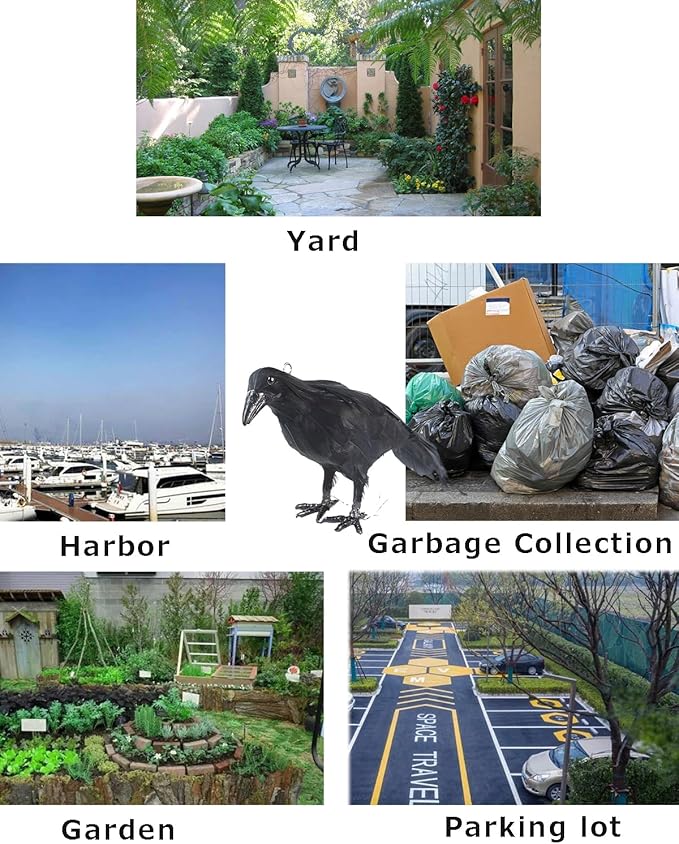 - 【TO SCARE BIRDS AWAY】: This fake crow will scare other birds away (For pigeons, doves, sparrows), you can hang the crow face up/or use the wire to make it stand up to scare other birds.