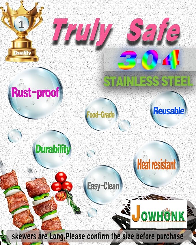 - 【FOOD GRADE 304 STAINLESS STEEL】JOWHONK BBQ 304 stainless steel skewers for grilling are 21.5 inches long,0.4 in width,0.07 in thickness. Our wooden handle flat metal skewers for kabobs are made of premium 304 stainless steel, Ensuring non-rust long time durability, Heat resistant and non-poisonous,Harder than other stainless steel and iron.It's safety for children.Our Premium Stainless steel Barbecue skewers are reusable. The BBQ kabob skewers surface is smooth that grilled food residue won't get stuck onto the kabob skewer blade.
