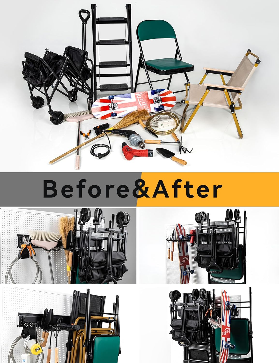 - [48"MULTI-FUNCTION GARAGE WALL TOOL RACK] Garage hanging storage rack can hang a wide range of tools and equipment including shovels, brooms, rakes,ladder,garden and yard tools, power tools, folding chairs, sports skateboard, cables, cables,Collapsible Wagon Cart ,Foldable Wagon,Stroller ,hosesand more. All adjustable hooks can snap on the rail and move around on it to meet your actual needs
