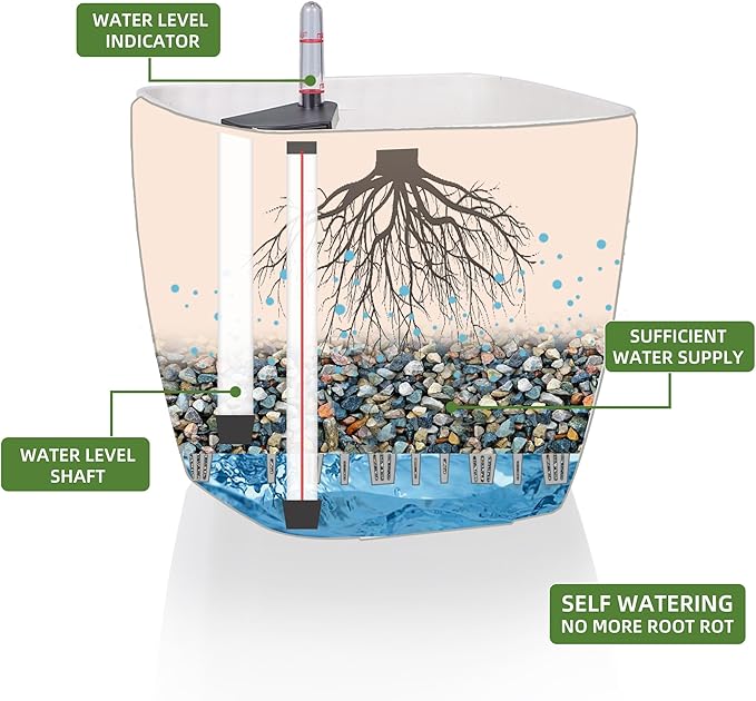 - SELF WATERING & NO MORE ROOT ROT - The smart unique sub-irrigation system is one of the most appealing aspects among all Dexceder planters. The easy-to-use separated integrated water reservoir or catcher- keeps your soil well aerated and automatic supplies plants with the right amount of ongoing moist air & nutrition for optimal growth. The insert indicator shows you the exact time to water again. The full water supply period can single-handedly last over 3 weeks based on different live plants