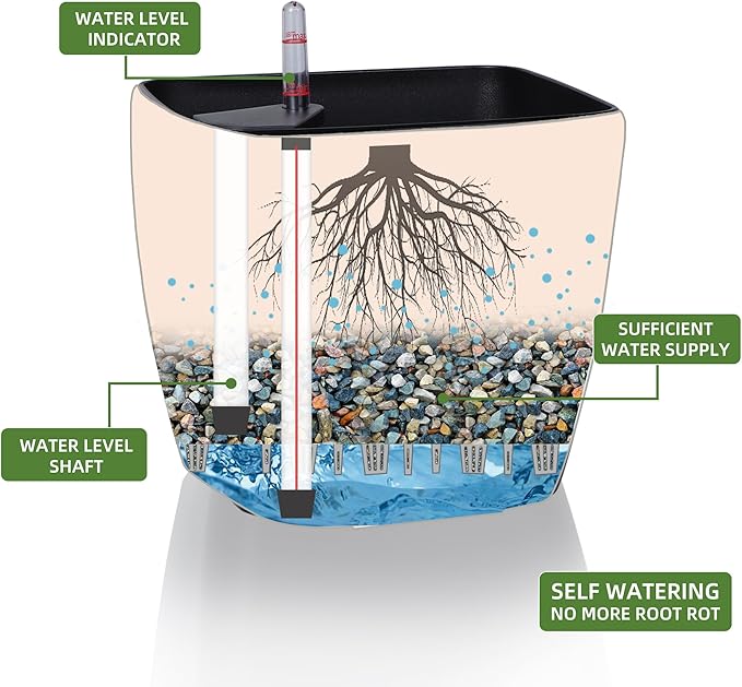 - SELF WATERING & NO MORE ROOT ROT - The smart unique sub-irrigation system is one of the most appealing aspects among all Dexceder planters. The easy-to-use separated integrated water reservoir or catcher- keeps your soil well aerated and automatic supplies plants with the right amount of ongoing moist air & nutrition for optimal growth. The insert indicator shows you the exact time to water again. The full water supply period can single-handedly last over 3 weeks based on different live plants