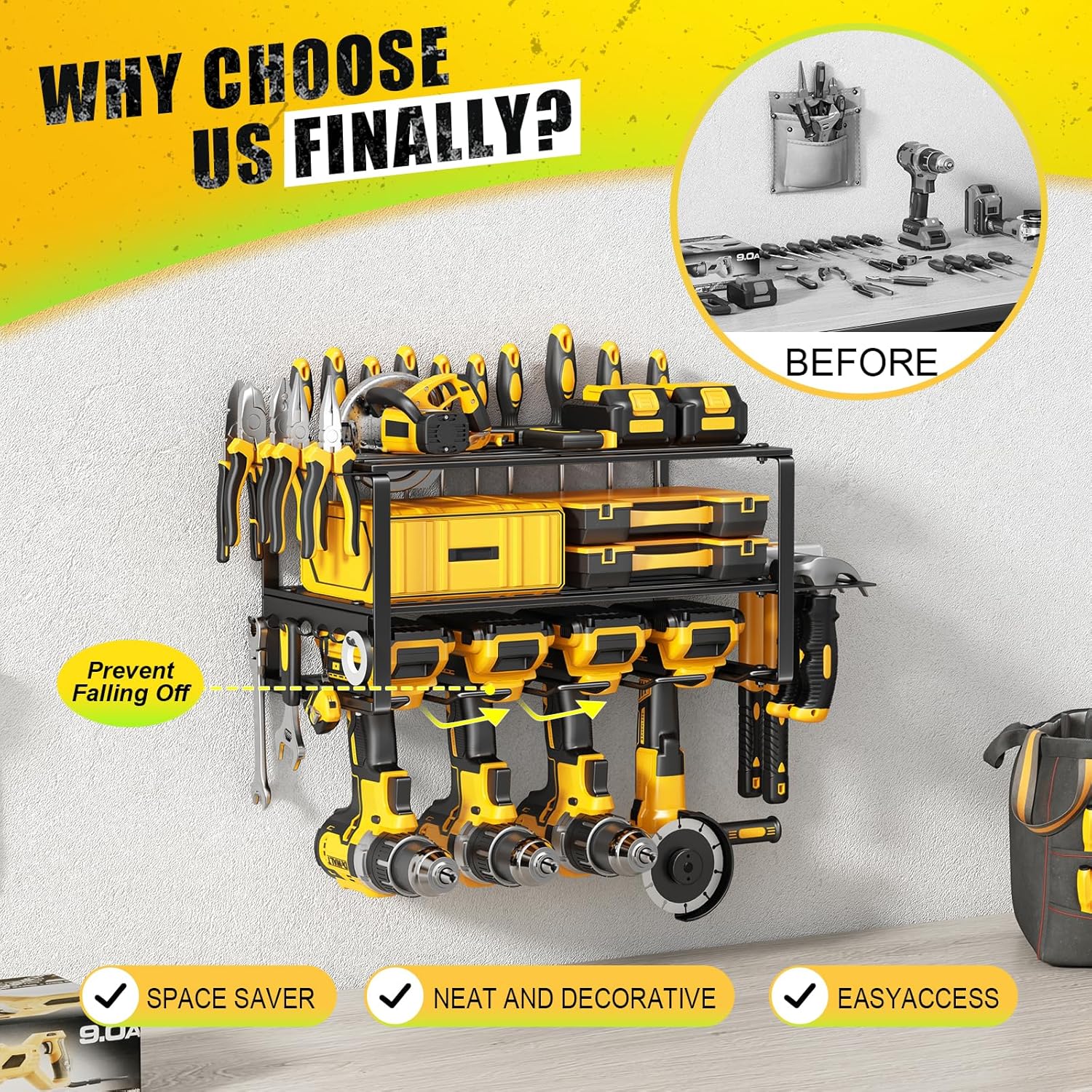 - Easy to Install: Our power tool organizer wall mount includes all necessary mounting hardware and clear instructions for easy installation. refer to the professional installation manual, you can assemble a perfect tool rack wall mount in just a few minutes