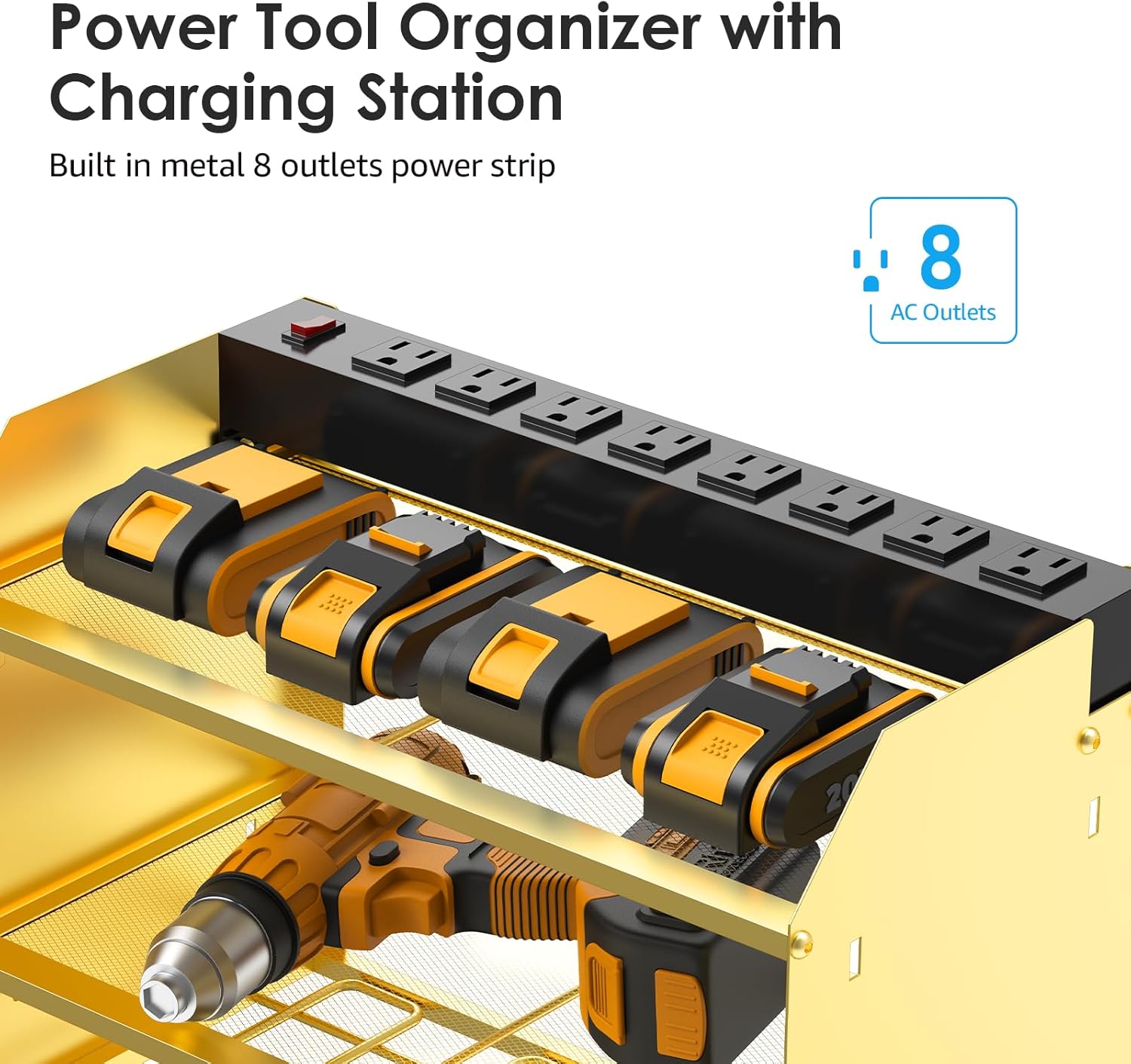 - Special customized glossy gold color power tool organizer with charging station, come with 8 outlets. If you have a lot of rechargeable tools, you can charge everything right in the rack and avoid searching for sockets. 6ft power cord included.