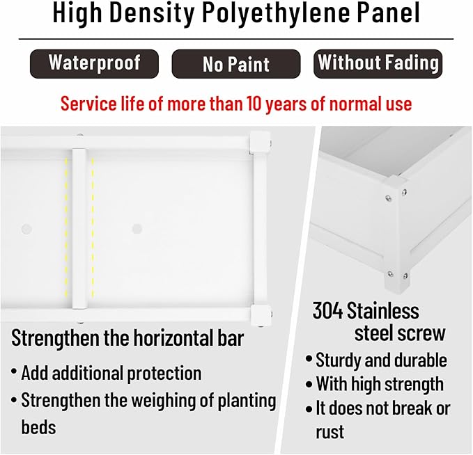 - Safety:Raised planter box outdoor made from HDPE,with no water or oil-based coatings, ensuring that your fruits, vegetables, plants, and herbs grow safely