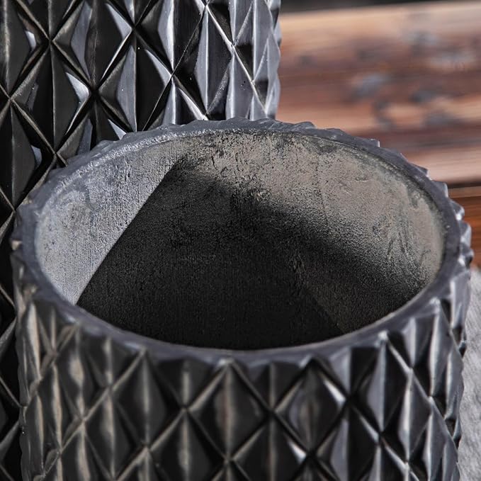 - [Unique Design]:The cylindrical cement planters used the Black lozenge pattern designs, giving the planters a unique aesthetic appeal and adds unique visual effect to the outdoor space