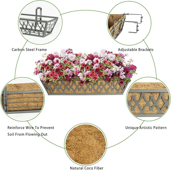 - Heavy Metal & Coconut Coir Fiber Liner: Crafted from robust carbon steel with a rust-resistant powder coating, this large black hanging planter box is strong and corrosion-proof, the natural coco fiber promotes healthy plant growth with good breathability and water retention, suitable for year-round planting, both indoors and outdoors