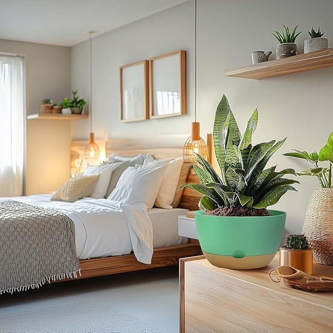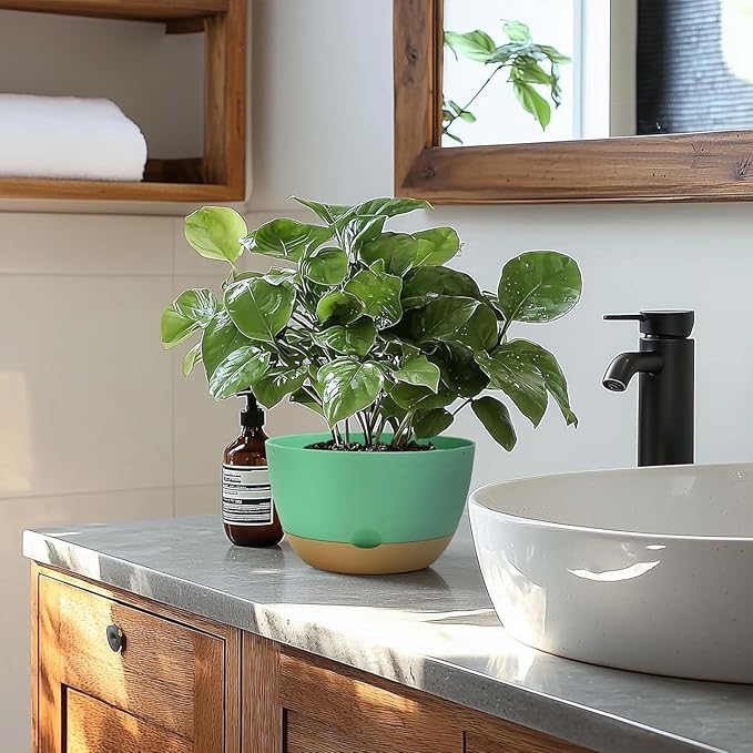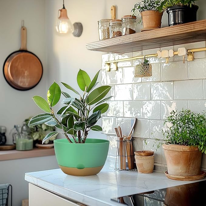 10 Inch Pots for Indoor Plants, Large Self Watering Planters with Drainage and Saucers, Plastic Outdoor Flower Pot, Set of 2, Green
