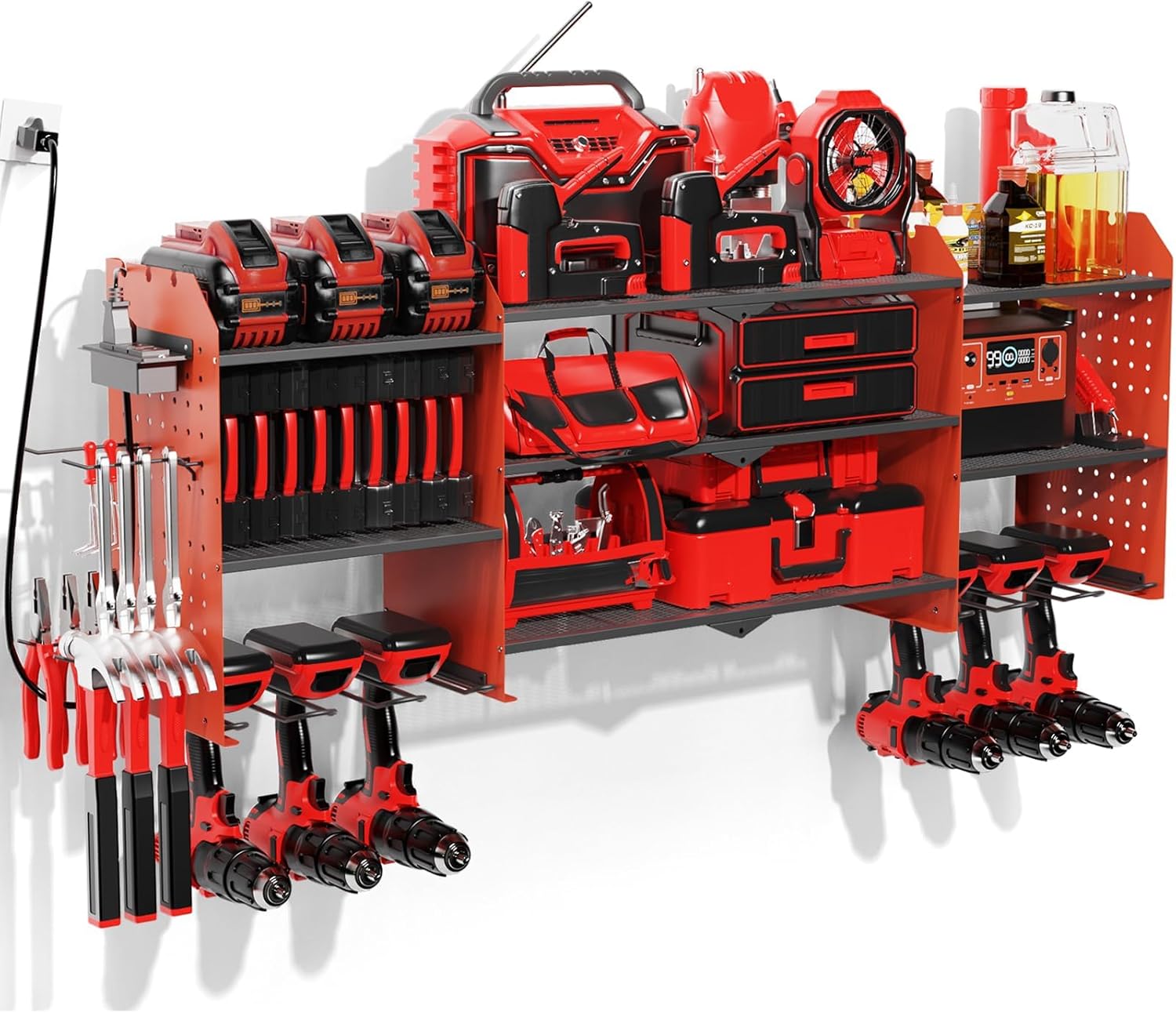 - Power Tool Organizer with Charging Station: Position outlets on either side to keep your tools charged. The American-standard power strip (Output: 125V/12A/1500W) provides device protection, frees up top-shelf space, and clearly displays power status. Includes a 6.56 ft power cord for easy setup