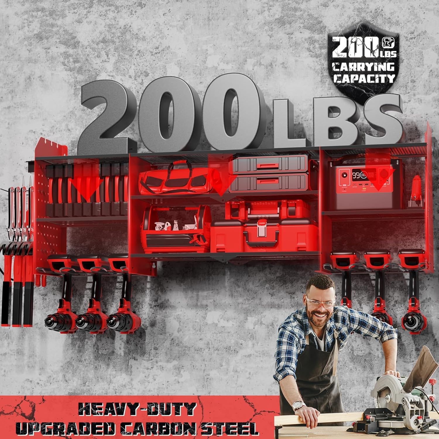- Stable Structure with High Load Capacity: Made from heavy-duty upgraded carbon steel, this wall-mounted tool organizer is strong, stable, and resistant to deformation, supporting up to 200 lbs (40 lbs per shelf). It features easy assembly with included Phillips screws and screwdriver for a hassle-free installation