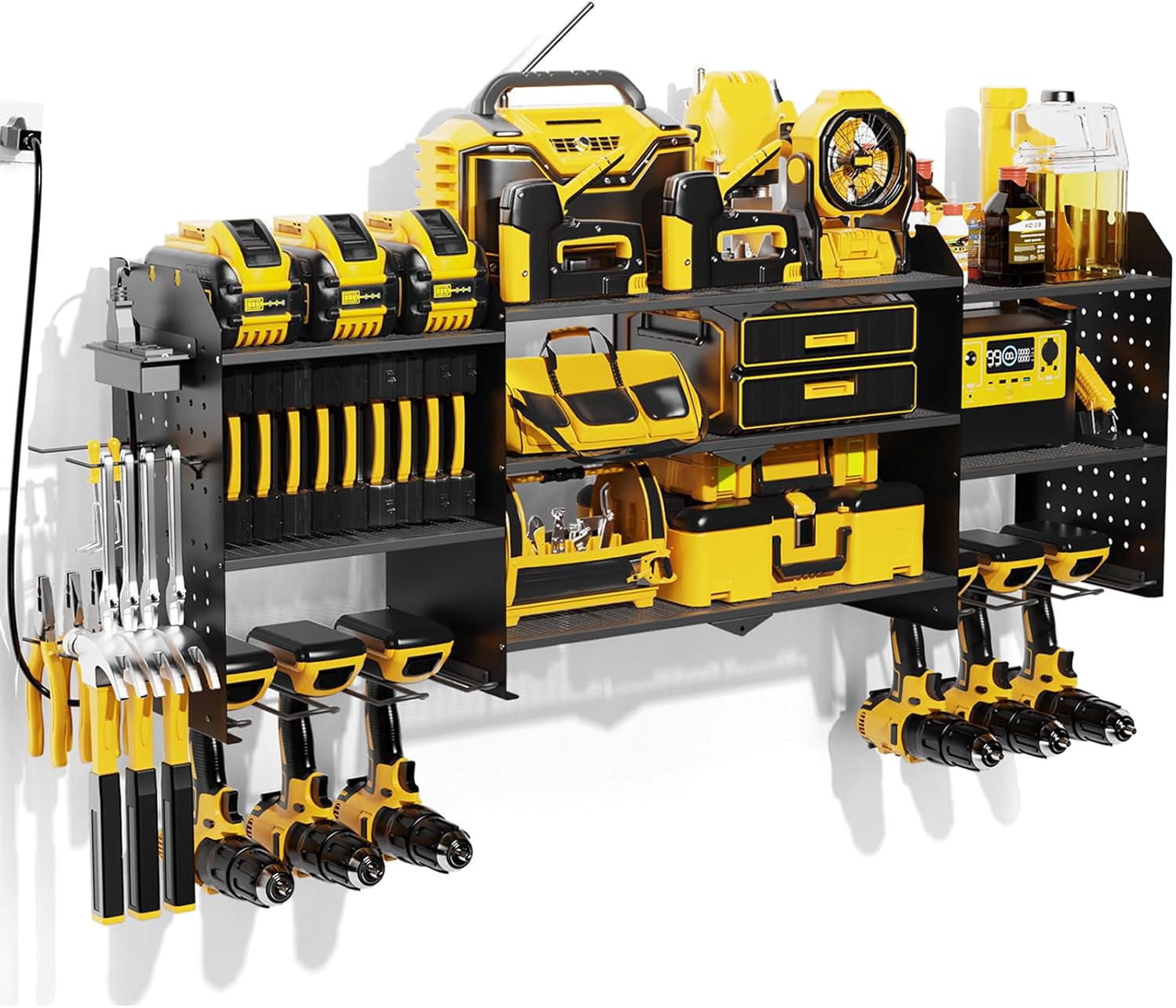 - Expanded Width to Maximized Storage: The Xankzi power tool organizer wall mount with charging station features a patented wide design in its 2 central shelves, perfect for storing more tools, especially longer items like chainsaws. Measuring 45.6" wide, 16.5" high, and 8.7" deep, this sturdy and space-efficient power tool storage rack keeps your tools organized