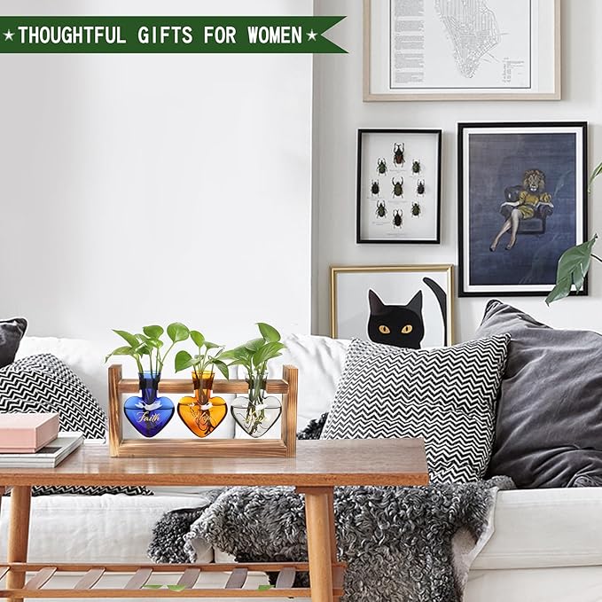 Plant Terrarium Propagation Stations Faith Hope Love Hydroponics Home Garden Decoration Gift for Women with Wooden Stand Heart Shaped Colored Glass Vase