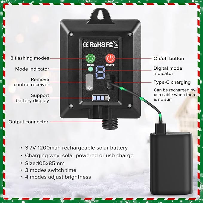 - Work time 10-12h: bright candy cane lights designed with upgraded large solar panel, it can be charged by solar or usb cable in cloudy or rain day. Auto charging 6-8h in daytime, it will auto lights up about 10-12h after fully charge in night
