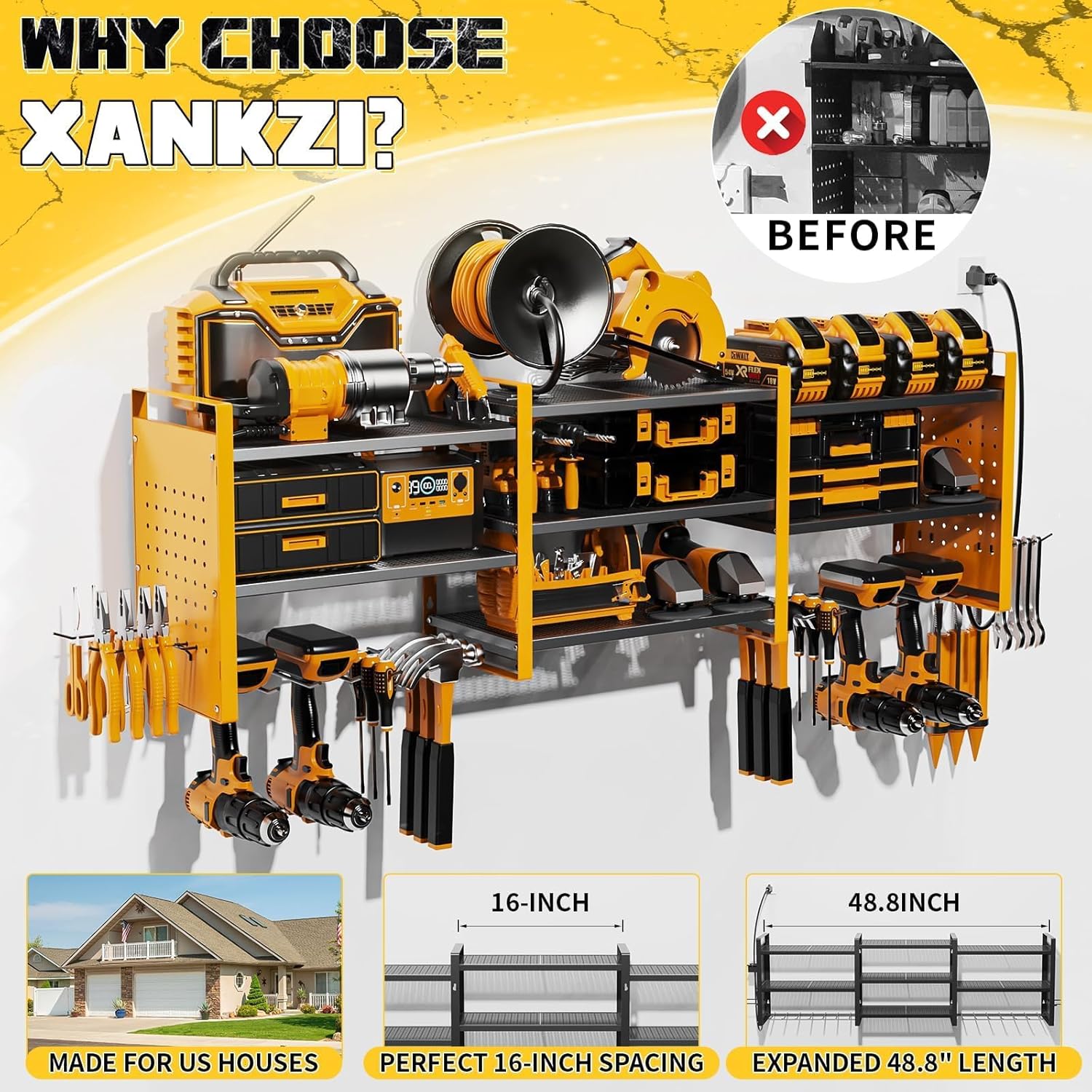 - Expanded Width to Maximized Storage: The Xankzi power tool organizer wall mount with charging station features a patented wide design in its 2 central shelves, perfect for storing more tools, especially longer items like chainsaws. Measuring 45.6" wide, 16.5" high, and 8.7" deep, this sturdy and space-efficient power tool storage rack keeps your tools organized