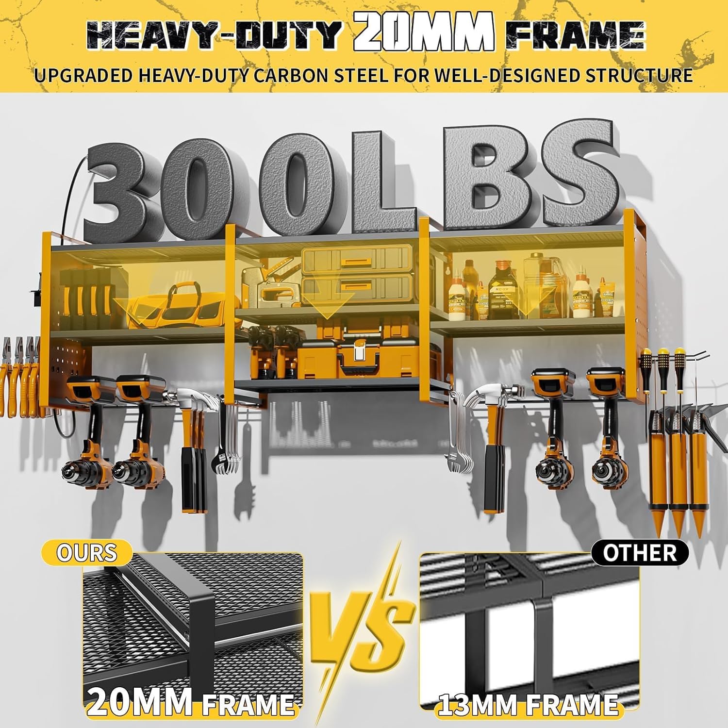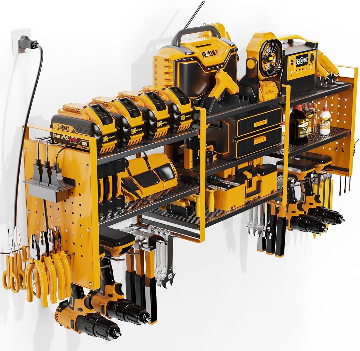 Power Tool Organizer with Charging Station Wall Mount, 3 Layer Expanded Heavy Duty Garage Organization, 48.8 Inch Length Garage Tool Storage, 4 Drill Slot, 16" Standard Hole, Yellow