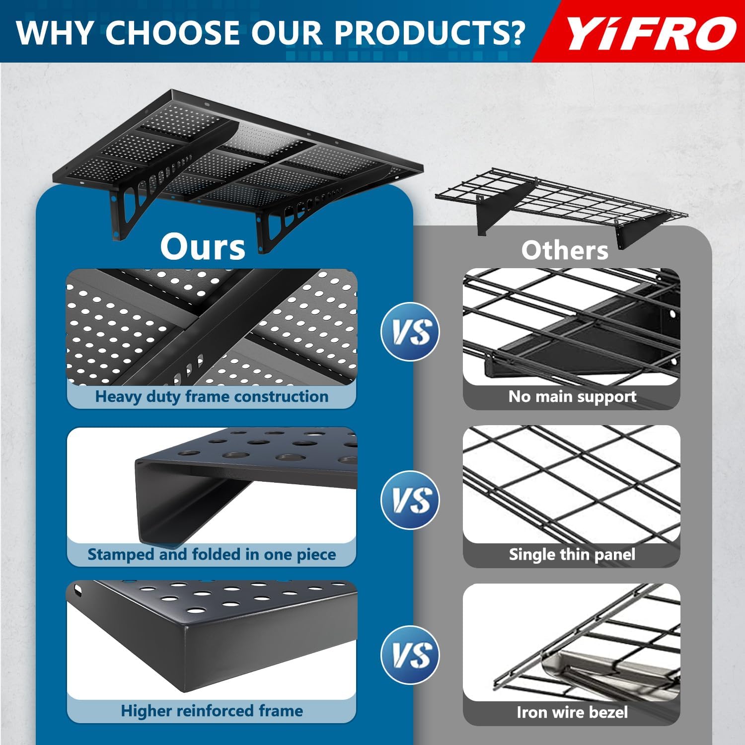 - HEAVY DUTY CONSTRUCTION: YIFRO garage wall shelving takes its cues from architectural frame construction, with a 1.5x4 ft individual bracket load capacity of 250 lbs. and a total of 500 lbs. for 2 shelves, which makes it easy to store most of the items in your garage.