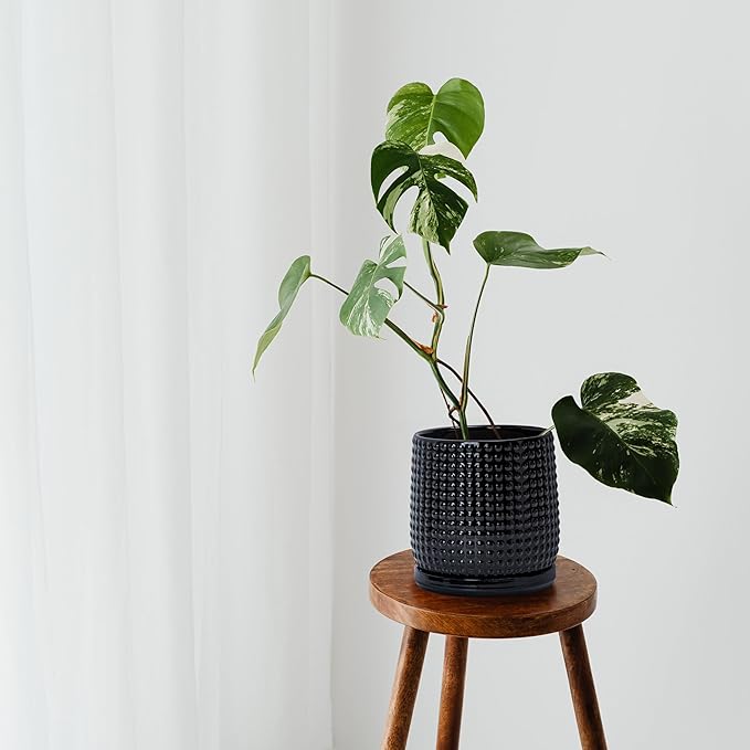 D'vine Dev Set of 2 Ceramic Plants Pots, 6 Inch Beaded Stoneware Flower Pot for Plants with Drainage Hole and Saucer, Glossy Black, 27-E-X-2