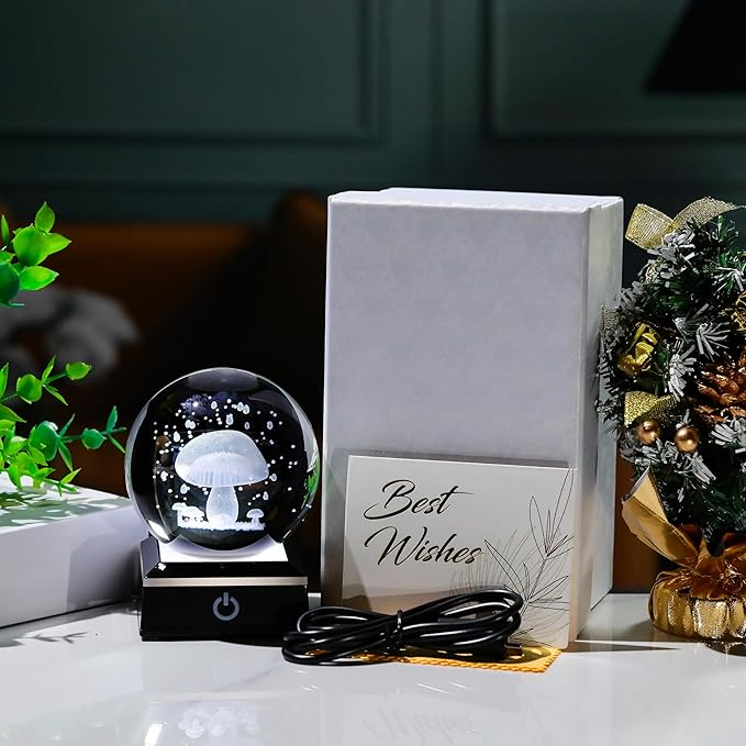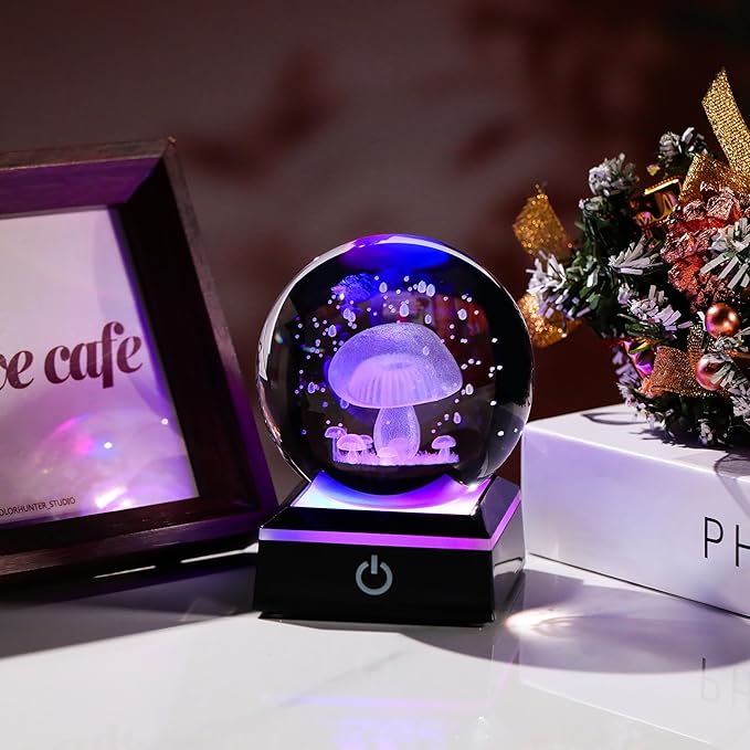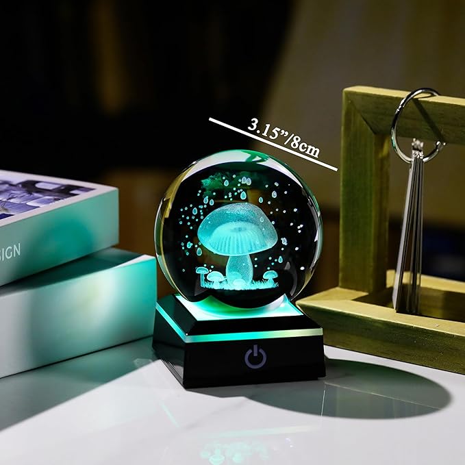 - Crystal Ball Mushroom Lamp- Crystal Glass Mushroom Night Light size: 3.14". Made of K9 Crystal, Interior images are carved by Advanced 3D Laser Engraving Technology.