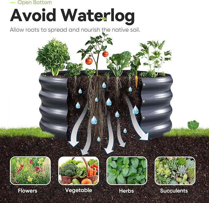 - 【Rolled Edge Design, Open Bottom】The rolled edges of the iron sheets prevent cuts during installation or planting, making it safe to use around pets and children. The open base design prevents water accumulation and rot, allowing roots to breathe better and providing a healthy environment for plant roots.
