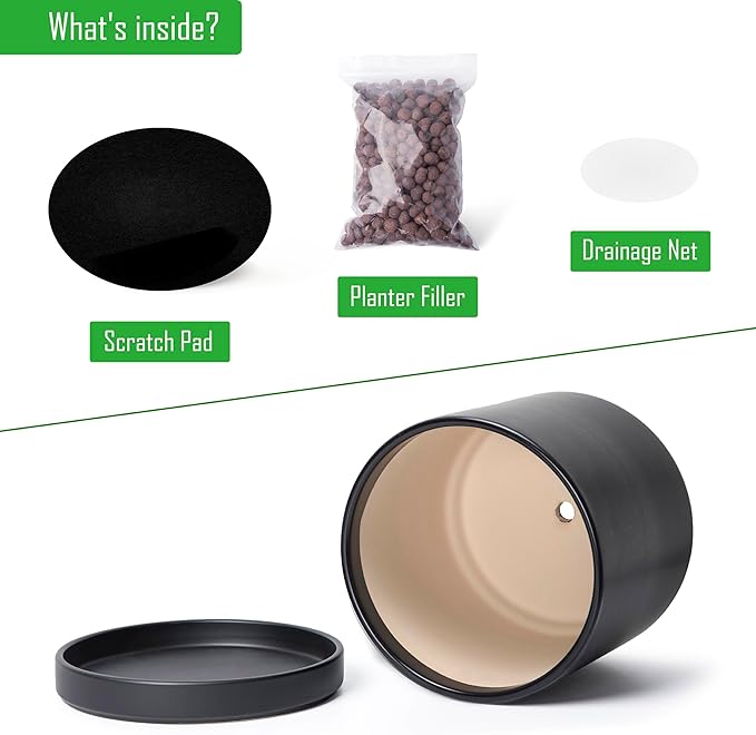 - Planter pot with drainage hole, mesh drainage net and protective scratch pad included.