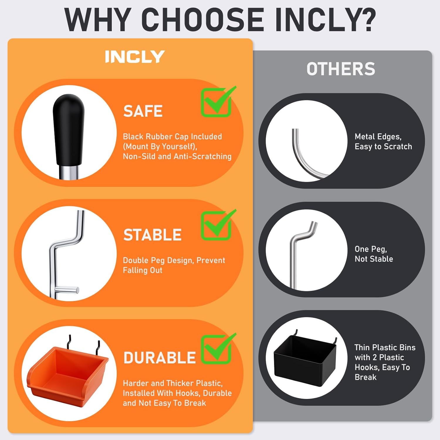 - WIDE APPLICATION: The INCLY pegboard tool organizer is ideal for storage solutions on a wide range of garage, workbench, craft room, workshop, kitchen, shop, tool sheds, factory, or warehouse. This pegboard kit helps you to well organize your various stuff