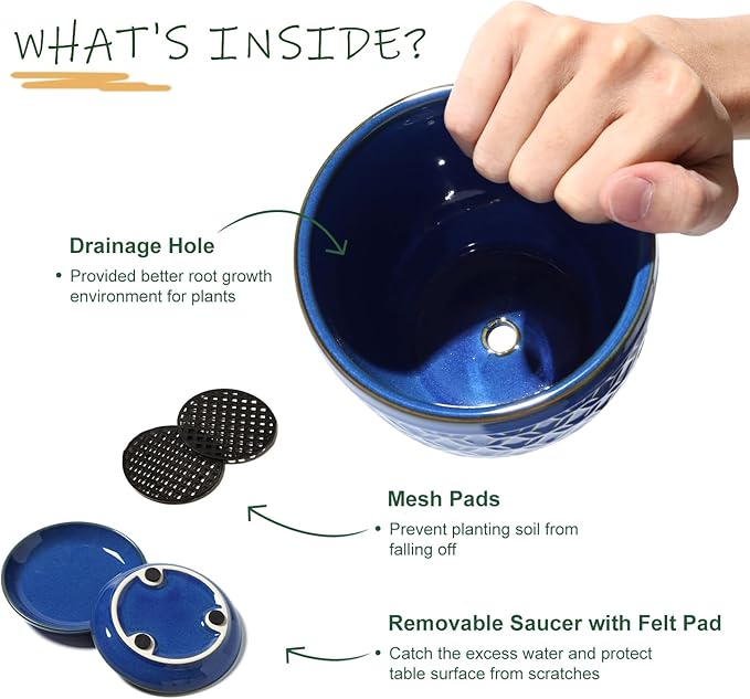 - Ceramic Plant Pots with Drainage Hole: Each small plant pot measures 3.5''W*2.8''H , which is the ideal for growing small and medium sized plants, such as succulents, snake plants, cactus, orchid and small flower. The flower pots has a central drainage hole and saucer to ensure adequate drainage and ventilation to avoid root rot, and include a 1.7 inch diameter mesh to prevent soil from falling out