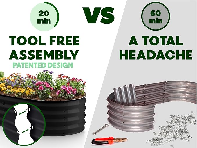 - EFFORTLESS ASSEMBLY, LIKE NO OTHER! Begin your planting journey by choosing our innovative patented design, featuring the perfect combination of easy assembly and durability. Thanks to our unique tool-free design, assembly is a breeze and can be completed in just 30 minutes! Get started on your garden right away and enjoy fresh, healthy produce in no time.