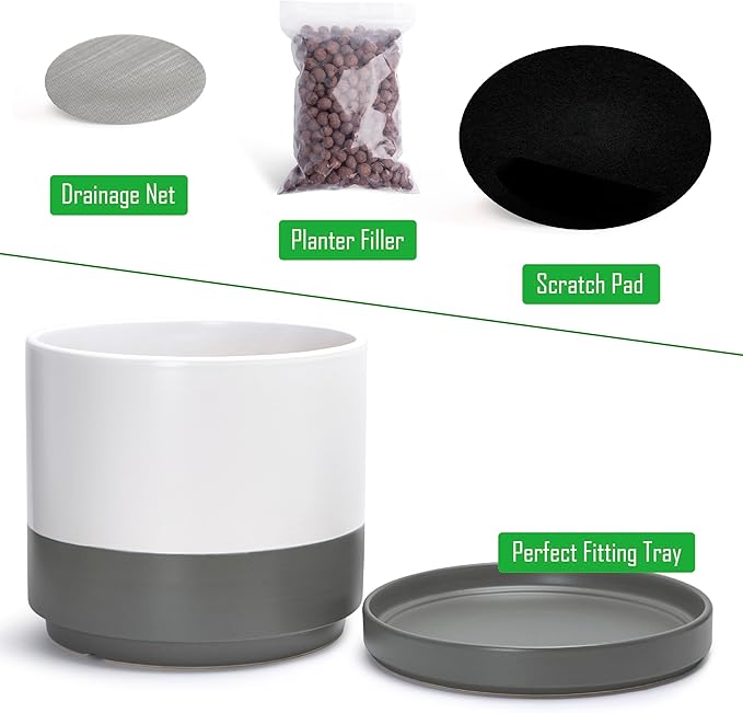 - Planter pot with drainage hole, mesh drainage net and protective scratch pad included.
